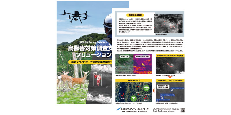 ドローンとAI解析技術を組み合わせた鳥獣害対策調査支援ソリューションを紹介しています。被害の未然防止や早期対応に向けた、効率的かつ実用的な調査体制をわかりやすくまとめたパンフレットです。