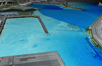当社は焼津港で想定された「津波により港内へ家屋や漂流物が流入した」事案を踏まえ、航路啓開の実務に直結するデジタル測量支援を提供しました。具体的にはマルチビーム測深による海底地形取得、ドローン搭載のレーザー測量(グリーンレーザー)による消波ブロック等の陸上構造物の計測、そして海底・陸上データを統合した3次元点群データの作成と訓練当日の利活用支援を行いました。これらのデータは「平時に取得した基準データ」として保存し、災害発生後の再測量と比較することで堆積土砂量や障害物の位置を素早く特定することを目的としています。